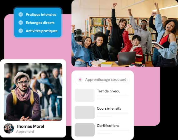Explorez nos différentes solutions pédagogiques ci-dessous, classées par par modalité. Profitez de la dynamique de nos cours en groupe pour une immersion collective ou optez pour l'efficacité de nos cours particuliers standards ou sur mesure, disponibles aussi bien dans notre centre qu'en classe virtuelle.